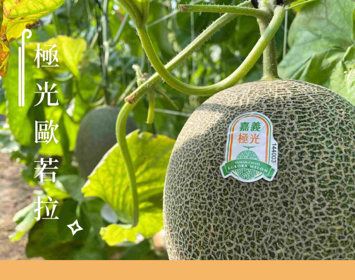 嘉義極光哈密瓜,是嘉義縣政府大力推廣的頂級新品種「嘉義極光歐若拉」(Aurora Melon),是哈密瓜中的奢華代表。其橢圓飽滿的外型、翠綠色的網紋、薄而細嫩的果皮、酥脆多汁的果肉,與如水梨般清脆爽口的口感,堪稱奢華享受。溫室栽培的特殊環境使其甜度高達14度以上,每一口都帶有迷人的焦糖奶香,甘甜不膩,冷藏後風味更豐富。